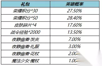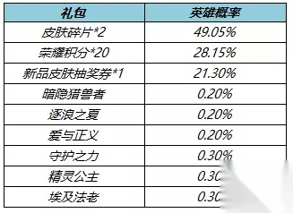 皮肤碎片&积分自选礼盒:打开礼包可任意选择以下奖励之一:荣耀积分*10或皮肤碎片*1 春日超值礼包:打开礼包可任意选择以下奖励之一:铭文碎片*600、战令币*40、战令经验*2000 春日豪华礼包:打开礼包可任意选择以下奖励之一:铭文碎片*600、战令币*80、战令经验*4000、紫星币*5 头像框自选礼包:打开后可任意选择以下奖励之一:阖家欢乐头像框、万象回春头像框、福寿康宁头像框、钻石*50 击败特效礼包:打开后必得400铭文碎片,可额外随机获得以下击败特效:虎啸风生击败特效、KO击败特效其中之一。重复获得的击败特效会转换为90钻石。 两大皮肤秘宝上架 上架时间:2月18日0:00-2月21日 23:59 超值皮肤秘宝 购买红蓝对决(1日),可额外随机获得以下之一:暗隐猎兽者、逐浪之夏、爱与正义、守护之力、精灵公主、埃及法老、荣耀积分*20、新品皮肤抽奖券*1、皮肤碎片*2。 价格:20点券 每日限购200个 概率公示: