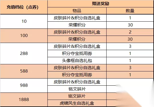皮肤碎片&积分自选礼盒:打开礼包可任意选择以下奖励之一:荣耀积分*10或皮肤碎片*1 头像框自选礼包:打开后可任意选择以下奖励之一:阖家欢乐头像框、万象回春头像框、福寿康宁头像框、钻石*50 虎啸风生自选礼盒:打开后可任意选择以下奖励之一:虎啸风生击败、虎啸风生回城、战令经验*4000 每日充值送击败特效