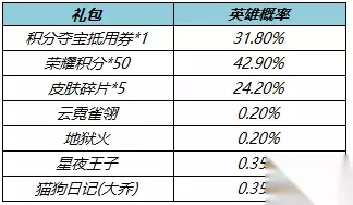 优选皮肤秘宝 购买酷炫机甲(1日),可额外随机获得以下之一:云霓雀翎、地狱火、星夜王子、猫狗日记(大乔)、荣耀积分*50、积分夺宝抵用券*1、皮肤碎片*5。 价格:50点券 每日限购100个 概率公示: