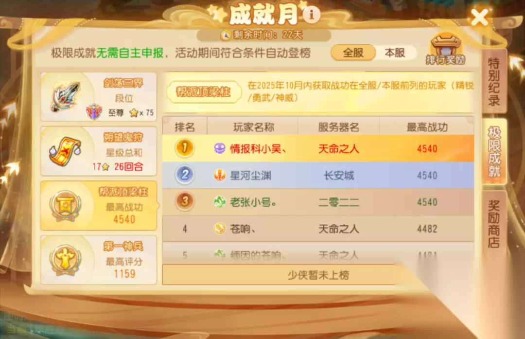 (三)帮派顶梁柱 在2025年10月内获取战功会被记录,自动纳入排行。各位少侠要多多参与帮战,尽可能多地获取战功哦。