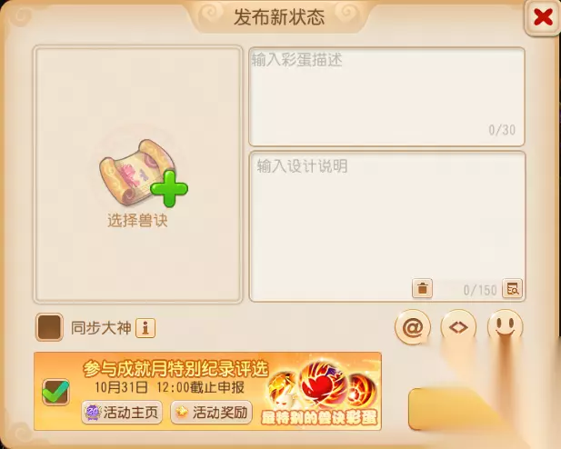 武器评分由基础属性、附加属性、特效、特技这四大要素决定。如若能打出高基础属性、高双加的双蓝大特技武器,评分就会更高,排名也会更靠前哦。 特别成就 本期特别成就主题为“最特别的兽诀彩蛋”,各位少侠在成就月活动页面点击右上角“发布纪录”,选好兽诀、输入彩蛋描述和设计说明后发布即可参选。