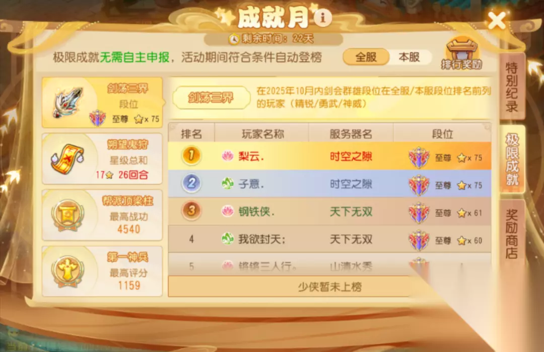 (一)剑荡三界 该成就正常参与剑会群雄活动,在2025年10月内前抓紧时间上分,积累胜场即可,期间获得的最高段位会被自动记录下来。