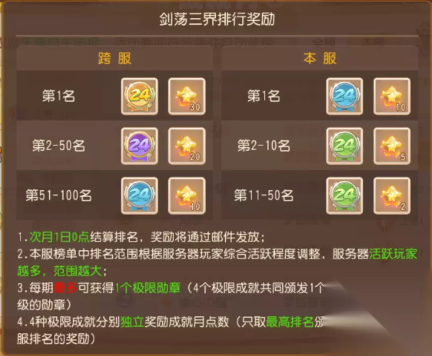极限成就 本期共有4个极限成就供各位少侠挑战,无需自主申报,活动期间符合条件便会自动登榜,最终根据每个单项在本服、全服的排名发放相应勋章和成就点数。