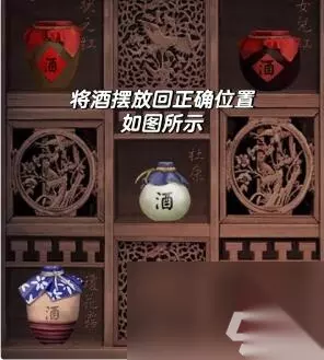 6、选择酒架,把酒摆到正确的位置上,通过刚才获得的酒杯品酒,结合刚才在下面看到的公告进行摆放。