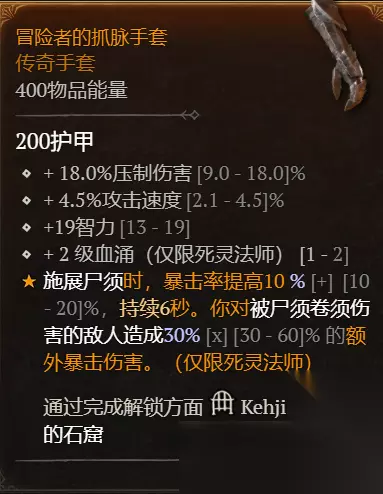 5、关键被动(35级,1技能点) 极大地提升了我们的生存能力和伤害输出。已经每6次施放一次压制,因此增加我们的最大生命有助于增加伤害输出,同时每15秒给我们一个免费的血涌。 6、更多被动(36-39级,14技能点) 36级:鼓舞领袖 37-38级:亡者之御 39-41级:伤害增效 42级:死亡增力 43-44级:死亡延伸 45级:阴森愈合 47-49级:凝结之血 7、声望(10技能点) 在暗黑破坏神 4 中集齐所有声望后,您有 10 个额外的技能点数可用于每个角色。您的首要任务是将它们用于我们上面显示的升级进度。 声望1-3:鲜血之潮 声望4-6:死亡之拥 名声7-8:鼓舞领袖 声望9:亡者之御 声望10:吸取活力 二、死者之书 1级时就可以召唤骷髅兵,从5级开始,当书籍菜单解锁时,可以自定义您的骷髅散兵。从那里可以解锁更多类型的骷髅战士、骷髅法师并最终随着你的升级解锁魔像。 1级:培养骷髅 5级:骷髅战士——散兵 12级:骷髅战士——收割者 15级:骷髅法师——寒冷 25级:傀儡——骨头 31级:牺牲傀儡——骨头 三、武器 +xx% 核心技能伤害 +xx% 压制伤害 +xx% 对近身敌人的伤害 +xx 情报 +xx 所有统计 将你的武器插入 红宝石每当发现升级时,至少在铁匠处升级 1-2 次。 四、装备 头:智力,最大生命,抗性,冷却缩减