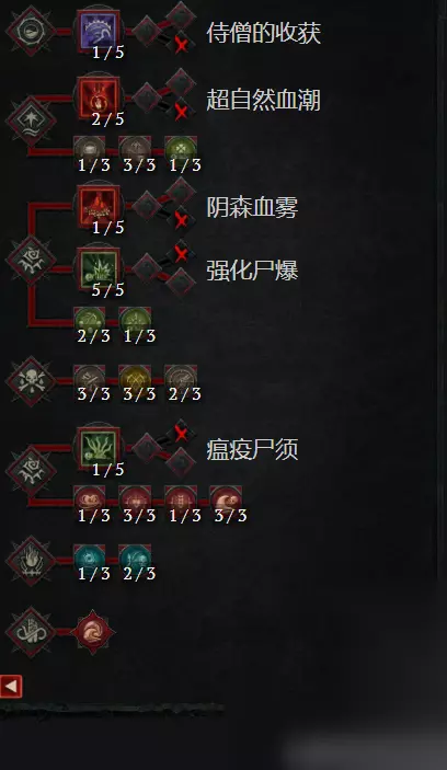 《暗黑破坏神4》血涌亡灵法师练级攻略 一、技能 1、入门(2-3 级,2 技能点) 2级:出血 3级:强化出血 首先,我们需要解锁我们的主要基本技能及其增强。在最初的几个关卡中,您的骷髅会帮助吸收伤害并输出一些它们自己的DPS。 我们用出血在生成我们的资源时应用单目标和多目标伤害。确保拿起血球在你战斗的时候! 2、解锁血潮(4-7 级,4 技能点) 4级:血涌 5级:强化血涌 6级:灵异血涌 7级:血涌 血涌开始似乎是良性的。初始脉冲伤害会击中整个屏幕并消耗一点让你保持领先。第二个脉冲较小,对更近距离的敌人造成更大的伤害。但是一旦你完全释放它的潜力,你就一直在处理压倒每个屏幕上的损坏。 3、解锁邪爆(8-17 级,10 技能点) 8级:邪爆 9级:增强邪爆 10-12级:血涌 13-16级:邪爆 17级:凿削血肉 不要浪费那些宝贵的恶魔身体来召唤细长的小骷髅,那些身体是伟大的饲料尸体爆炸多米诺骨牌机器!您的旋转变得非常简单。血涌增加一些伤害并掉落一些尸体,出血如果你需要形成另一个尸体然后按住尸体爆炸按钮,直到整个屏幕都被敌人的鲜血覆盖! 4、人群控制(18-22 级,5 技能点) 18级:亡骸卷须 19级:强化亡骸卷须 20级:瘟疫亡骸卷须 21级:枯萎邪爆 22级:收割 规格 1:强化出血——强化收割 规格 2:出血——助祭的收割 现在让我们抓住我们需要的最后一个工具,亡骸卷须和收割。第一个将怪物拉到一个空间中,这样我们所有的技能都可以发挥最大效率!它非常适合生存能力、DPS 输出,也是其他人在团队游戏中的重要工具。第二个让我们开始每场战斗亡骸卷须开场白每次我们都生成一个尸体收割,每 5秒一次。