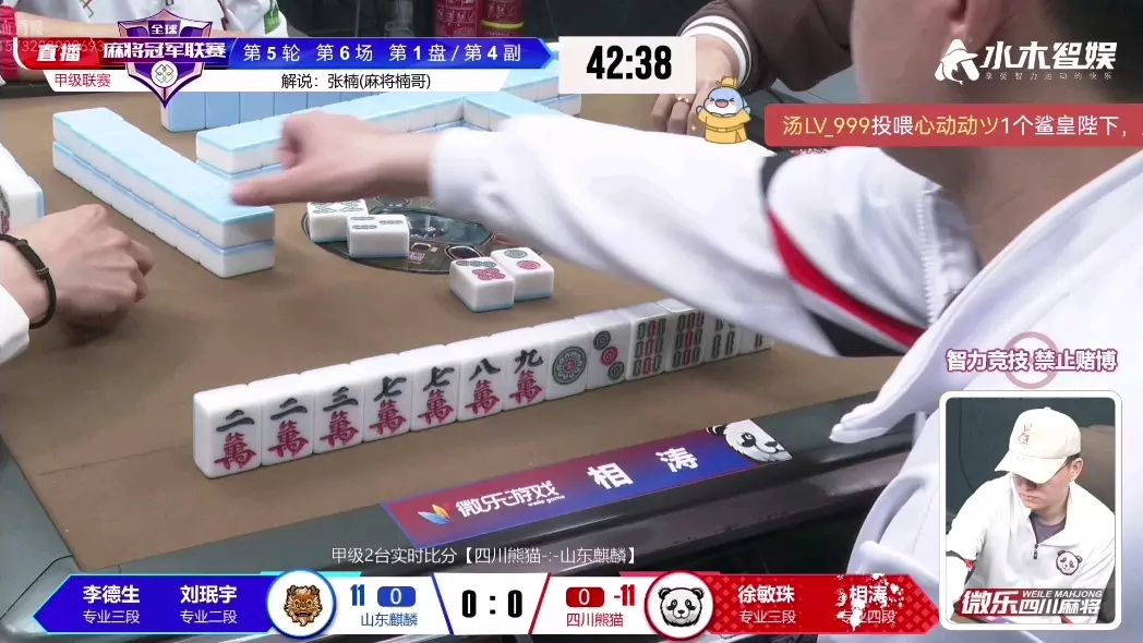 这是麻将冠军联赛甲级联赛第3轮第3场的直播解说内容,呈现了四川熊猫队与鲲鹏队的四川麻将对局,余涛担任解说,对局中展示了选手们的牌面与赛事实时比分,属于智力竞技麻将赛事。