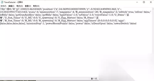 -再使用记事本打开,这里面就是我们的存档信息,其中的信息如下: HP是血量 H是粉条 ammunltion、magazine、R_ammunition是弹夹数量(子弹数量) isRifle、getGunAndKye是是否拥有枪械,没有获得枪械显示的是“alse”,将这两个都改成“true”就是拥有枪械 (修改的时候只需要修改“”当中的数字即可)