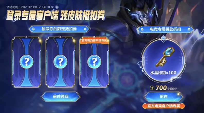 截止至1月18日,召唤师登录专属客户端,即可领取限定皮肤抵扣券,还可享受电竞专属水晶秘钥折扣!
