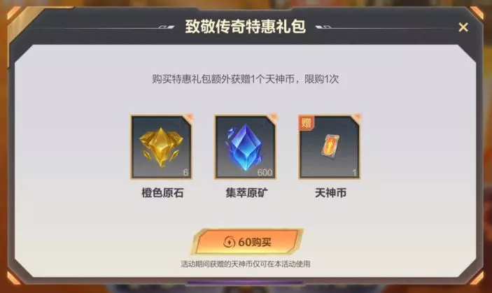 即日起,截止至2月9日,召唤师花费60点券即可购买特惠礼包,限购1次,礼包包含天神币*1、橙色原石*6、集萃原矿*600。