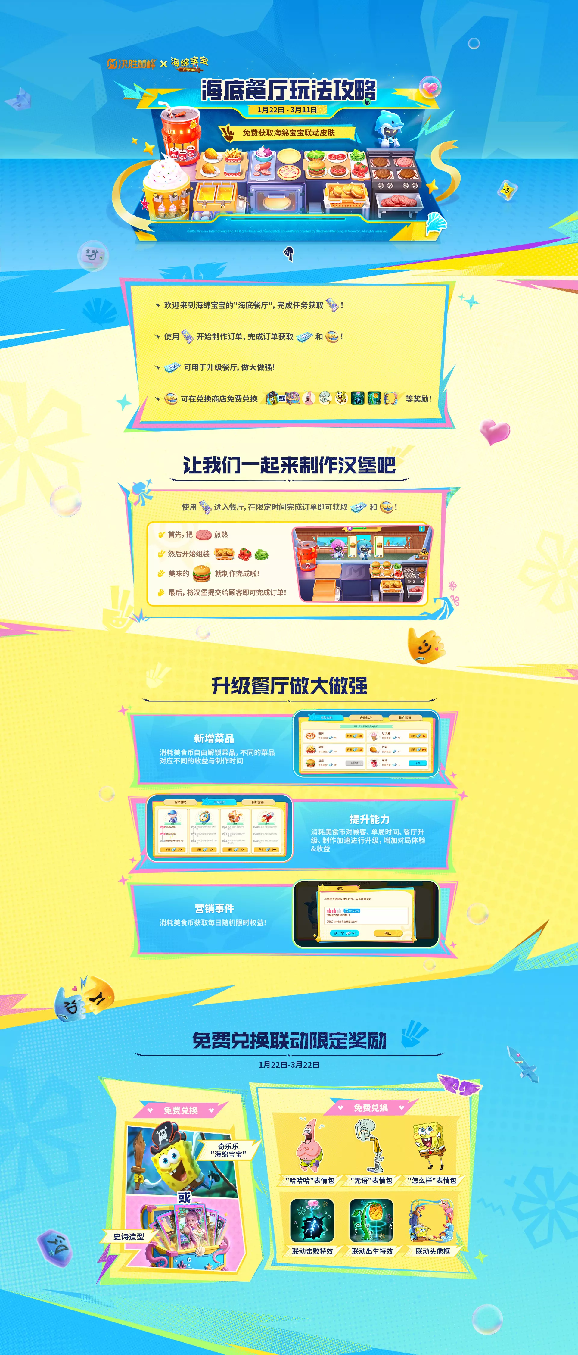 1周年超级福利《决胜巅峰》x《海绵宝宝》联动1月22日即将上线!海绵宝宝与派大星的联动皮肤、比奇堡联动特别玩法,这次由你来成为比奇堡餐厅主理人。特别提醒:《决胜巅峰》1周年专属福利,海绵宝宝皮肤免费送!