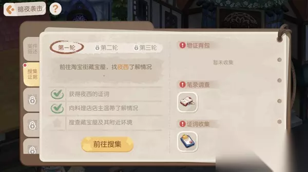 【搜查藏宝屋及其附近环境任务攻略】 第一轮线索: 1、线索一:你可以在奥柏百货前前面的空地上看到笔录调查的证据。 2、线索二:奥柏百货前前面两颗路灯中间金块面前的书本。