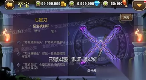 至宝——七星刀: 三阶:“特制清蒸鱼头”护盾效果增强。 四阶:“烈冰鲜鲷山”对另一名最虚弱友军生效。 五阶:花式鱼脍”会使友军的技能控制时间增强。
