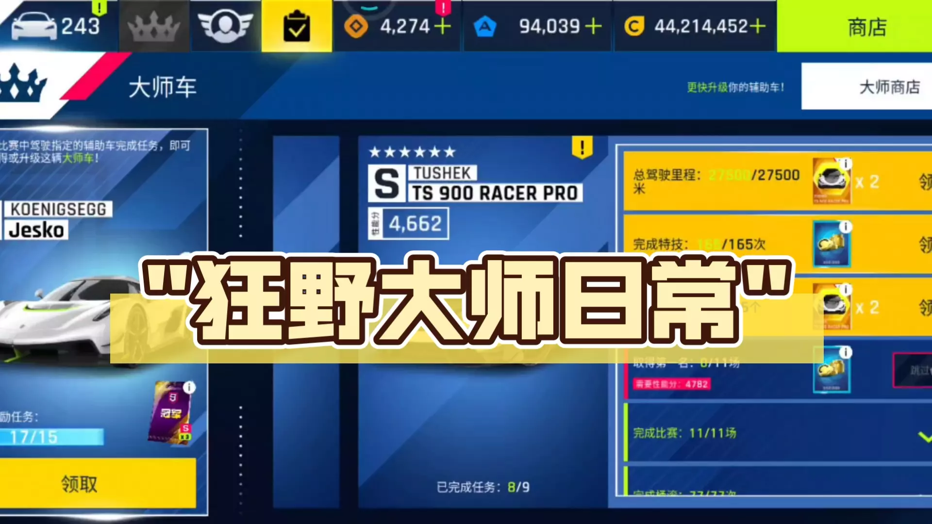 这是手游《狂野飙车9》的相关内容,展示了玩家狂野大师任务进度已到734/800,完成了725-734的日常任务,还展示了开卡获得的升级零件、卡牌等奖励,以及游戏内的赛事界面,玩家期待完成800任务进入超级大师任务。