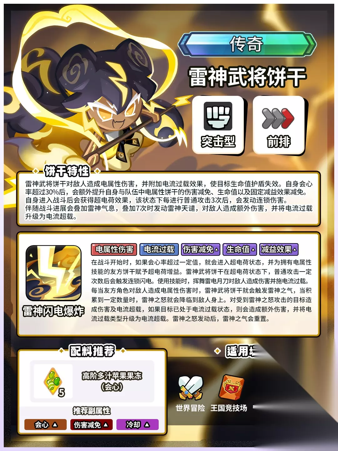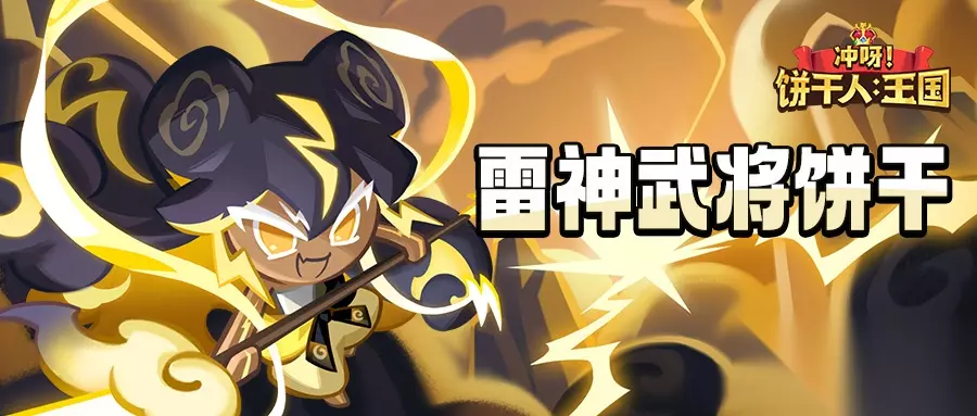 「我的雷电足以开天辟地!」 ✦技能特性 雷神武将饼干对敌人造成电属性伤害,并附加电流过载效果,使目标生命值护盾失效。 自身会心率超过30%后,会额外提升自身与队伍中电属性饼干的生命值、伤害减免、固定减益效果减免。 自身进入战斗后会获得超电荷效果,该状态下每进行普通攻击3次后,会发动连锁伤害。 伴随战斗进展会叠加雷神气息,叠加7次时发动雷神天谴,对敌人造成额外伤害,并将电流过载升级为电流超载。 ✦关键词条:电属性伤害、电流过载、伤害减免↑、生命值↑、减益效果↑ 战斗类型:突击型 作战位置:前排 ✦7日签到得「雷神武将饼干」 全新传奇「雷神武将饼干」将于5月29日全新版本降临,累计签到7日即可免费获得! ✦雷神武将饼干限时UP即将开放! >>活动形式:「传奇饼干扭蛋」 >>活动时间:5月29日00:00—7月2日23:59:59