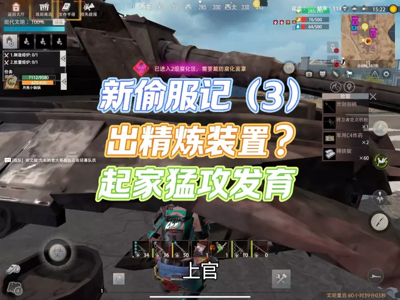 这是《文明重启》的游戏内容分享,玩家展示了在游戏里凌晨偷服发育的过程,包括拾取M762步枪等物资、升级工作台获取配方、进入腐化区开军火箱等,还提到自己运气不错,虽自嘲脸黑但收获不少。