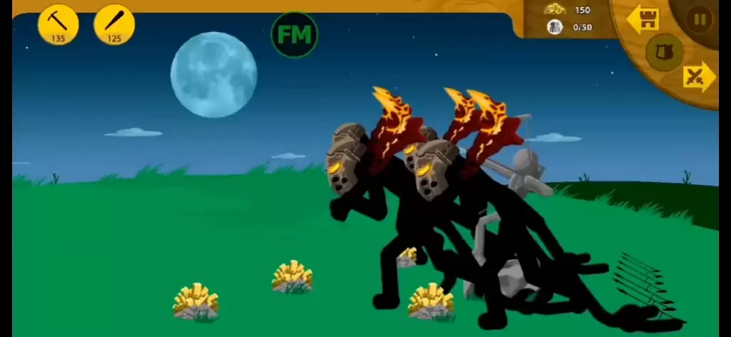 这是《火柴人战争遗产》的趣味改编内容,加入了牛头元素,画面里有黄金骷髅首领、火柴人士兵,还有趣味的牛头形象穿插,呈现出带有恶搞趣味的游戏对战场景,玩家需完成摧毁精英雕像的任务。