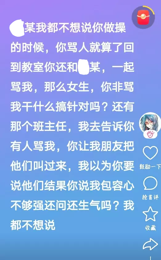 因为上操的时候,那个人说太热了就往这边挤。然后把我给挤出来了,然后又说不是他挤的然后我朋友也都知道是他挤的,然后呢上完早操之后就去骂他了结果他去告老师了结果还把老师和我朋友给挂网上了,这件事我告诉老师了结果老师没有管然后全靠我们那几个人解决了,一想起来我就特别想笑,那个人也有点傻