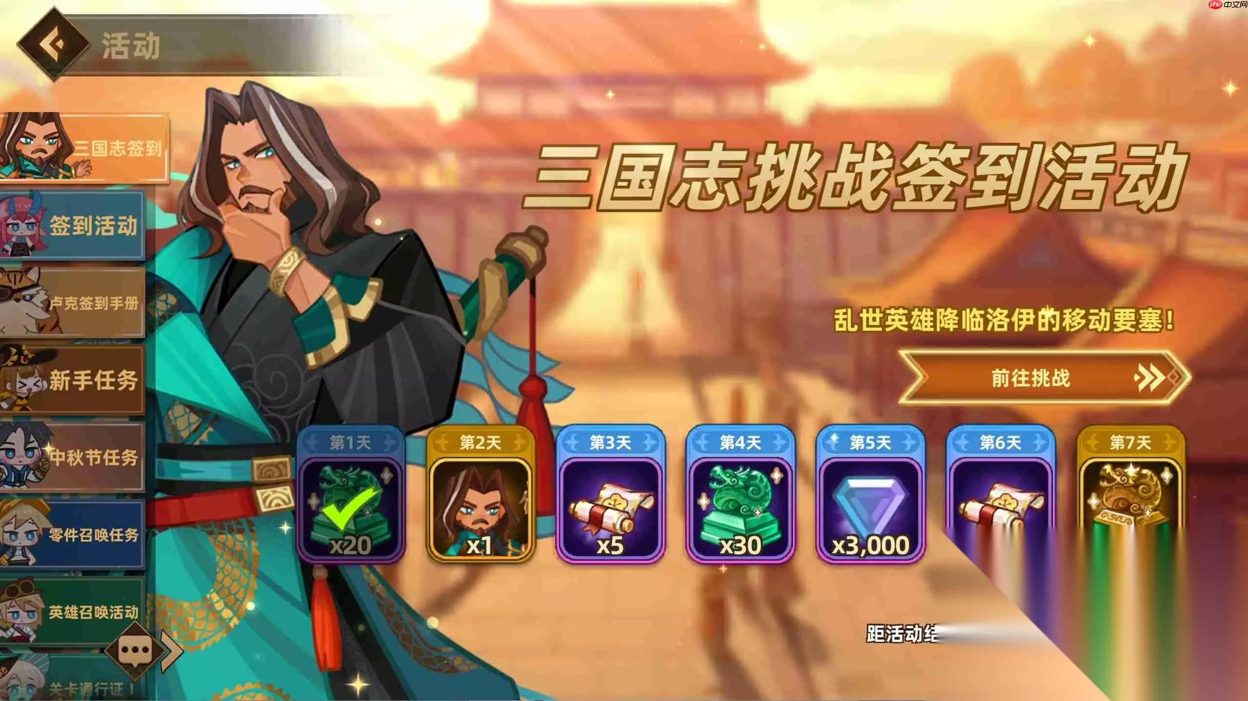 中秋献礼 双重福利放送 两大限时活动同步开启:? 「三国志挑战签到」——每日登录领好礼? 「中秋节任务特辑」——完成目标赢豪奖参与即可免费获得:✔ 2名联动英雄✔ 传说级角色皮肤✔ 大量升级材料与养成资源 节日惊喜不断,福利拿到手软!