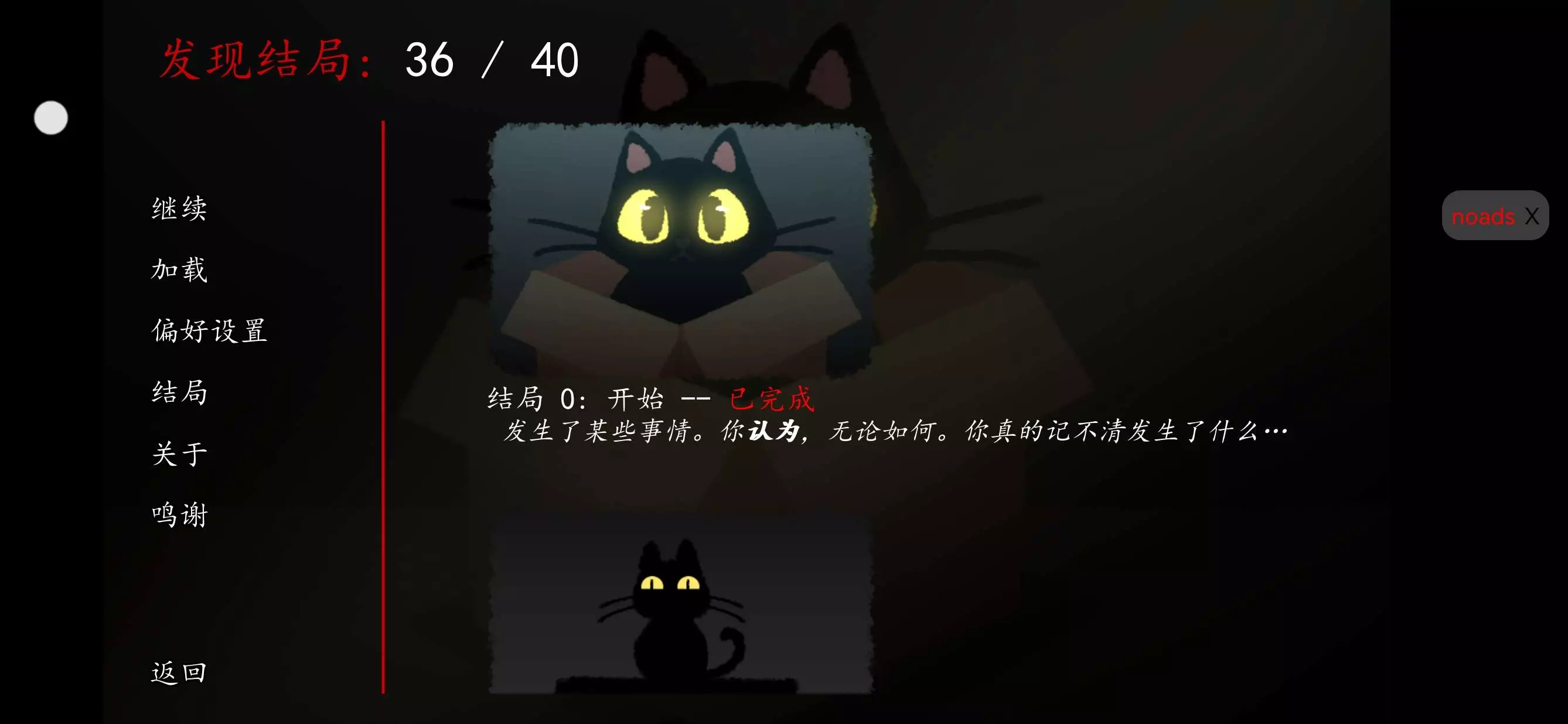 最后结局不要心软,如果你把结局全达成了,你会发现可以去,杀掉他,不过你要先输入这个klLL lL,如果你结局全达成了,那么箱子就会没有猫,但是你不要去点那串省略号这样如果你点了话你就不要点是的。因为你会发现那四个结局没了,达成四个结局,有些结局挺难的,就是你要一直躲避,就是躲避那个爪子爪子,如果出现在左边,你就往右边跑,也听别人说了,另一个就是相反,如果那个眼睛出现在你屏幕上面,往后跑,后面会越来越难,直接变成黑影了,给不了你反应时间,你就一个手放在左边上面,一个手放在右边那里看见黑影在哪里就按相反按钮,放右手那里的,位置管着中间和右边