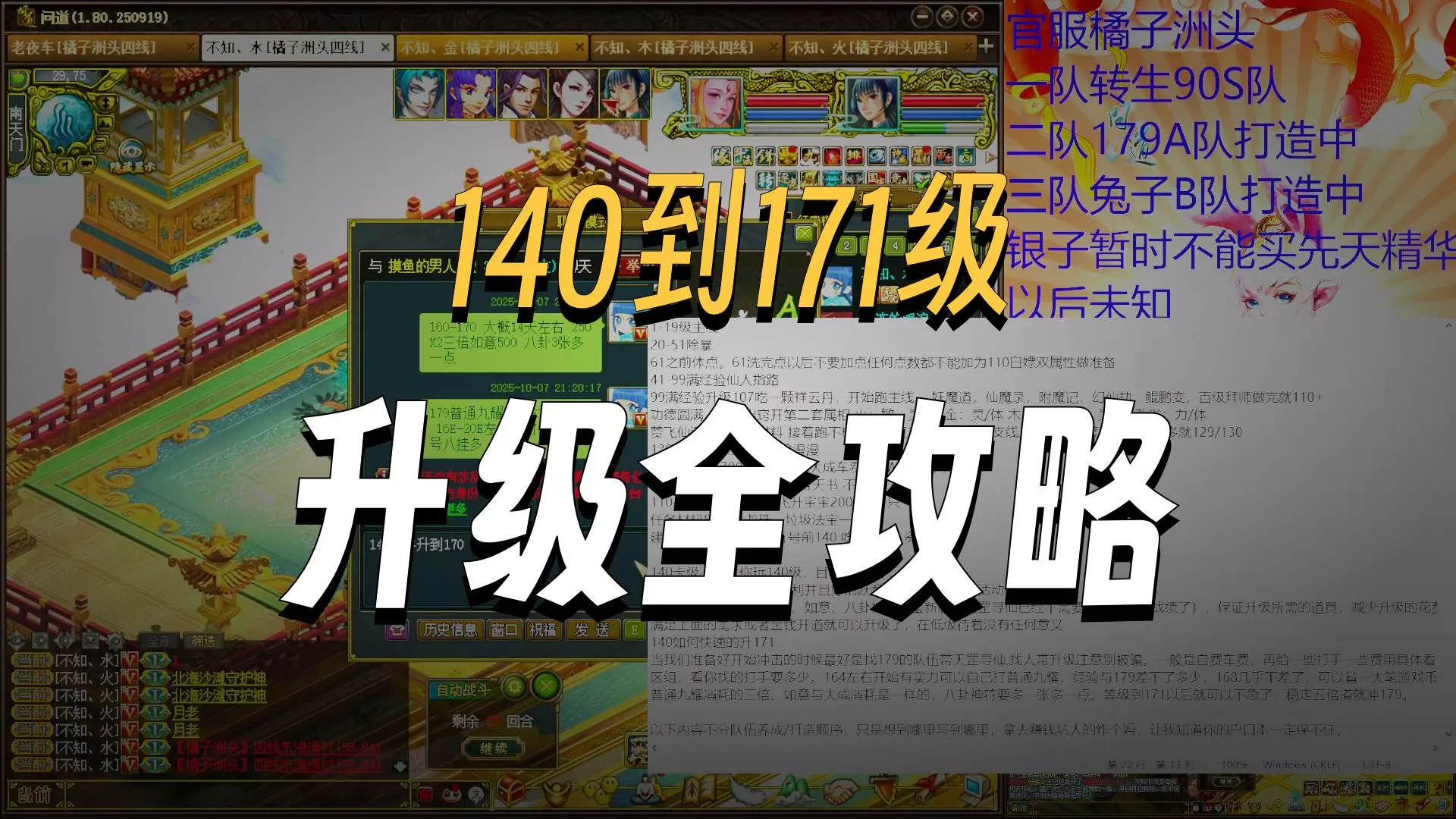 这是《问道》官服橘子洲头的玩家账号养成记录,该账号从去年2月起号,耗时十五个月养成179S队,还在打造另外两队,同时分享通天挂机内容,附带帮派收人、道具收购等信息,求估价该队账号。