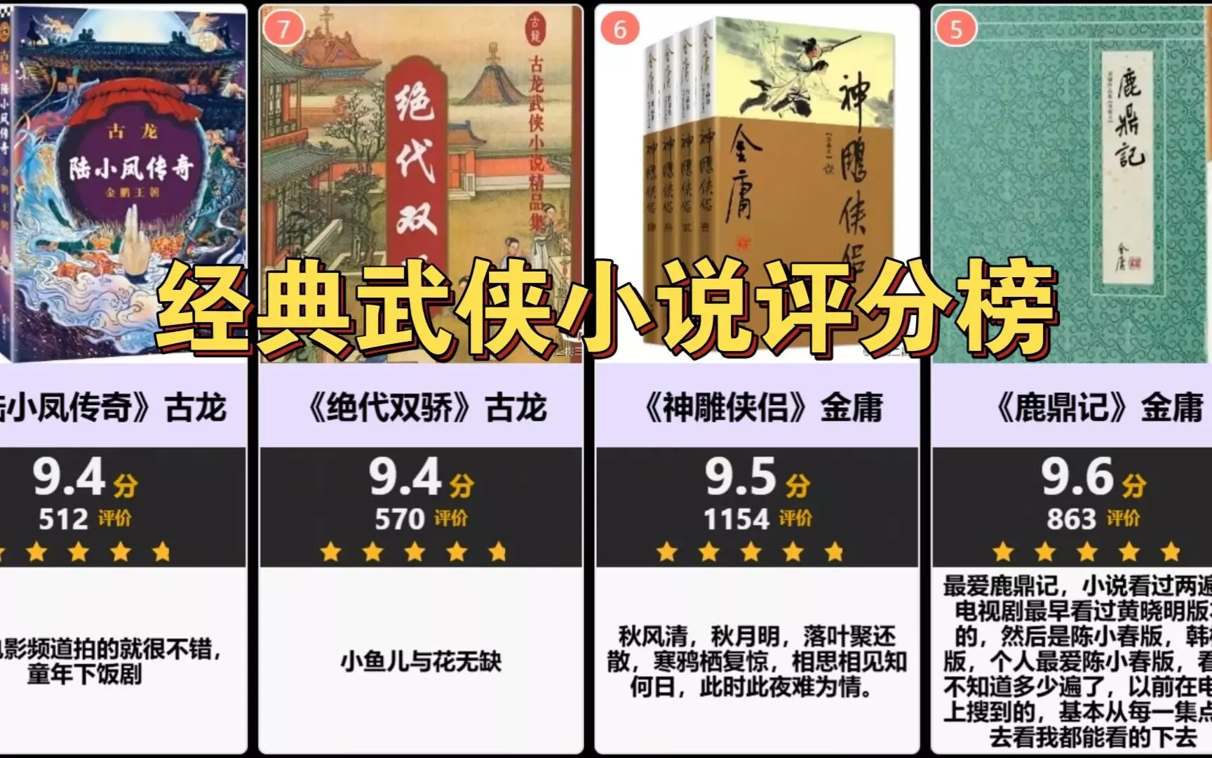 一、《天龙八部》 《天龙八部》是金庸先生的代表作之一,也是中国武侠小说的经典之作。这部小说以北宋年间为背景,讲述了少年杨过的成长历程以及他与小龙女之间的爱情故事。小说中的人物形象鲜明,情节曲折离奇,令人惊叹。同时,小说中也蕴含着深刻的哲学思想和人生智慧,是一部值得反复品味的经典之作。 二、《射雕英雄传》 《射雕英雄传》也是金庸先生的代表作之一,是一部以南宋年间为背景的武侠小说。小说讲述了郭靖、黄蓉等人的故事,其中描写了郭靖与黄蓉之间的爱情故事。小说中的情节曲折,人物形象深刻,令人难以忘怀。同时,小说中也蕴含着深刻的人生哲理和道德观念,是一部值得一读的经典之作。 三、《神雕侠侣》 《神雕侠侣》是金庸先生的代表作之一,也是中国武侠小说的经典之作。这部小说以元朝年间为背景,讲述了杨过与小龙女之间的爱情故事以及他们的冒险经历。小说中的情节曲折,人物形象鲜明,令人感受到了武侠小说的魅力。同时,小说中也蕴含着深刻的哲学思想和人生智慧,是一部值得一读的经典之作。 四、《倚天屠龙记》 《倚天屠龙记》是金庸先生的代表作之一,也是中国武侠小说的经典之作。这部小说以明朝年间为背景,讲述了张无忌与赵敏之间的爱情故事以及他们的冒险经历。小说中的情节曲折,人物形象深刻,令人难以忘怀。同时,小说中也蕴含着深刻的人生哲理和道德观念,是一部值得一读的经典之作。 五、《雪山飞狐》 《雪山飞狐》是金庸先生的代表作之一,也是中国武侠小说的经典之作。这部小说以清朝年间为背景,讲述了胡斐与苗人凤之间的恩怨情仇。小说中的情节曲折,人物形象鲜明,令人感受到了武侠小说的魅力。同时,小说中也蕴含着深刻的哲学思想和人生智慧,是一部值得一读的经典之作。 六、《白马啸西风》 《白马啸西风》是金庸先生的代表作之一,也是中国武侠小说的经典之作。这部小说以明朝年间为背景,讲述了杨铁心与穆念慈之间的爱情故事以及他们的冒险经历。小说中的情节曲折,人物形象深刻,令人难以忘怀。同时,小说中也蕴含着深刻的人生哲理和道德观念,是一部值得一读的经典之作。 以上就是几部经典的武侠小说,它们不仅仅是一部小说,更是中国文化的一部分。读完这些小说,不仅可以感受到武侠小说的魅力,还可以从中汲取到许多的人生智慧和道德观念。如果你还没有读过这些小说,那么赶快去阅读吧! 感谢大家的阅读,如果觉得本文内容对您有所帮助的话,别忘了收藏本站哦!