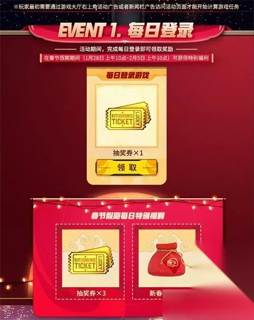 活动2:每日任务:完成每日设定的游戏时长任务,获得抽奖券的同时,还可获得新春福袋;