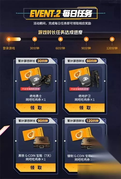 活动2:每日任务:完成每日设定的游戏时长任务,即可获得网吧吃鸡券及游戏宝箱,宝箱中有可能开出游戏道具!