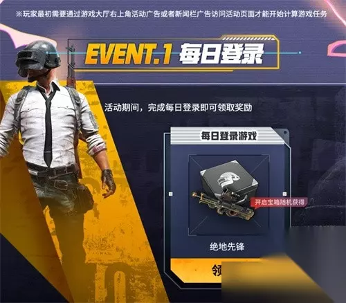 玩家只需在网吧中打开PUBG,点击游戏大厅右上角的活动广告或者新闻栏中的活动广告,即可跳转至专属活动页面,开启你的“网吧狂欢”。 本次活动参与简单,奖励丰厚: 活动1:每日登录:活动期间,玩家在网吧中每日登录游戏即可领取游戏宝箱,宝箱中有可能开出游戏道具!