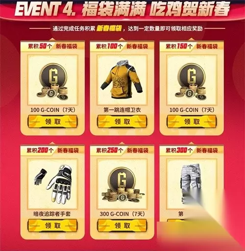 活动4:福袋满满 吃鸡贺新春:积累新春福袋,可兑换多款珍稀道具和皮肤。首次上线的连帽卫衣,长裤和暗夜追踪者手套让你的角色焕然一新,迎接新春的到来。