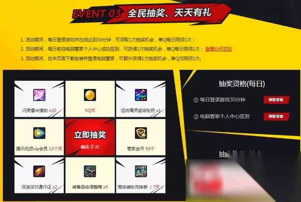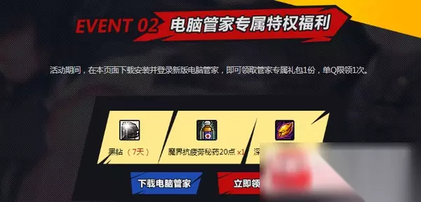 3.活动期间,在本页面下载安装并登录新版电脑管家,即可领取管家专属礼包1份,单Q限领1次。黑钻 (7天)魔界抗疲劳秘药20点 x1 4.活动期间,每日登录游戏并在线达到30分钟,可领取1次抽奖机会,单Q每日限领1次;