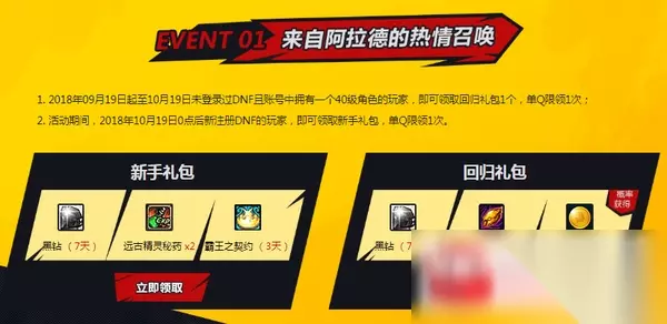 dnf11月管家黑钻领取网址入口及活动详解: 网址入口》》》点我进入 1.2018年09月19日起至10月19日未登录过DNF且账号中拥有一个40级角色的玩家,即可领取回归礼包1个,单Q限领1次; 2.活动期间,2018年10月19日0点后新注册DNF的玩家,即可领取新手礼包,单Q限领1次。