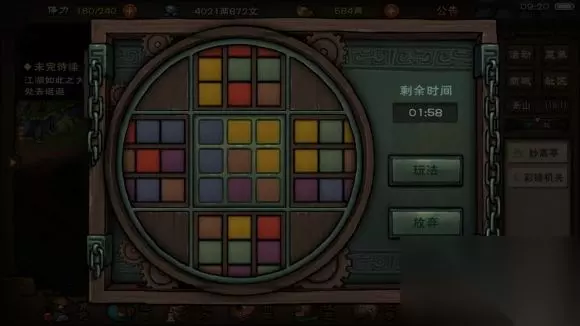 (秋秋亲传,小游戏技巧:先数一下每种颜色的方块数量,9个就是你的目标 比如上图只有黄色有9个,想办法把黄色移到中间就行了,小学生水平,不会的建议重修) 4. 翡翠玲珑杯(卖给古董商的再买回来),在背包中点欣赏,仔细观察,击碎杯底,得到神秘虎符 (注意:以上4个虎符必须修好画以后才能收集到) 收集到4枚虎符后,随便找个客栈睡一觉,醒来发现李鸦把你的虎符给偷走了…… 前往衡山(2.5)处找到李鸦,得知虎符被南派盗墓贼夺去,不过虎符一共有5枚,还有一枚在十方集。 十方集莫尔罕(7.15)打听可疑外乡人,水上漂进入22.2山洞,打一架后获得所有虎符 回衡山交给李鸦,接下来修复罗盘,需要材料: 桃木30 雪银30 蚕丝30 文房四宝1 蟾鱼1(泠月神水池钓) 在后续就是去将军冢进行探索了,通关将军冢后在(3.6)处搜索得《武威将军传》,了解生平,回去告知李鸦,蛇王已死,李大喜,赠与摸金符。
