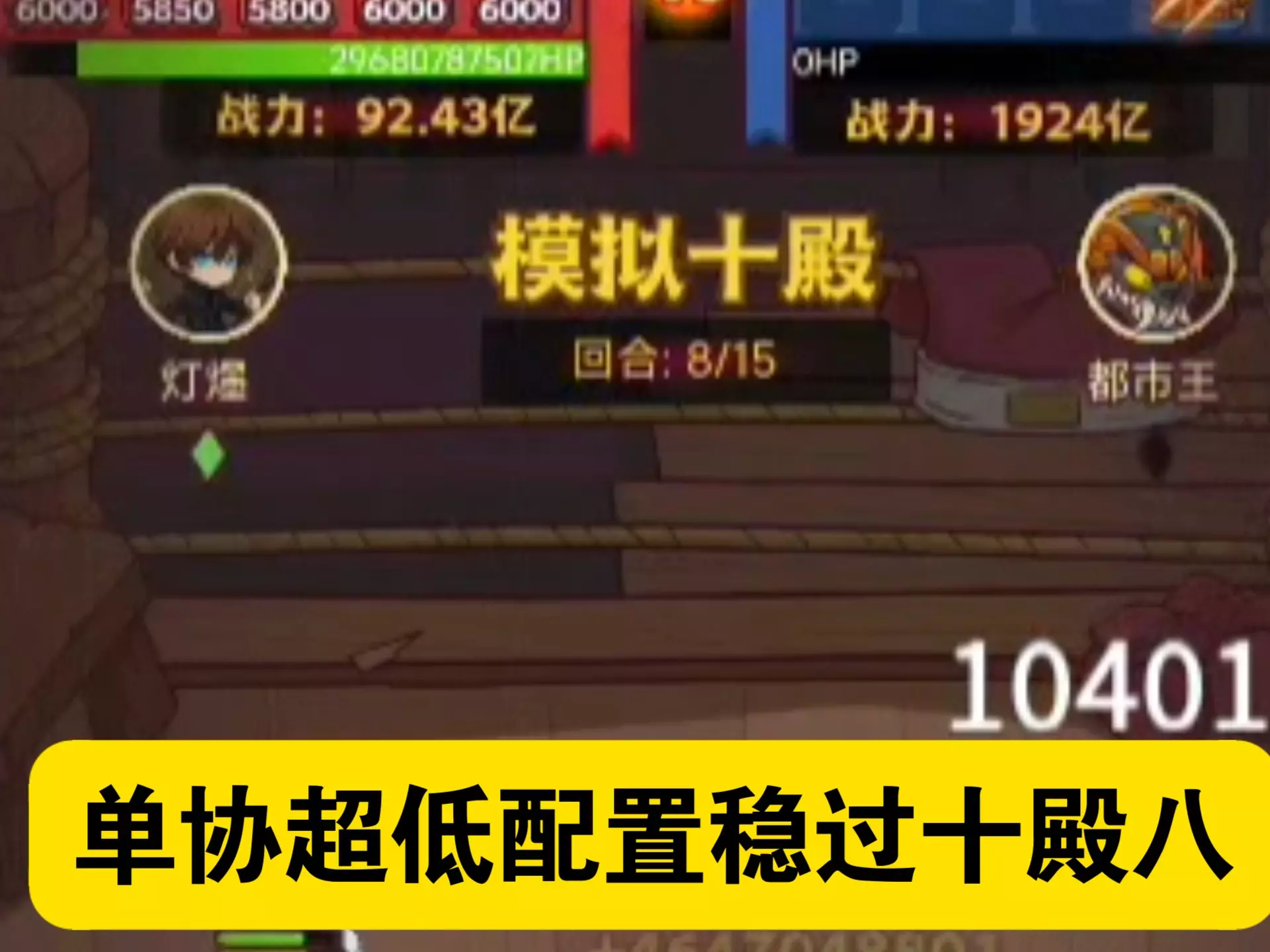 这是一篇游戏《模拟十殿》的通关教程,分享了单协力二星六回合过十殿七的方法,展示了对战泰山王的战斗过程,还提到若张角爆发足够也可无协力通关,洗练内容在教程结尾。