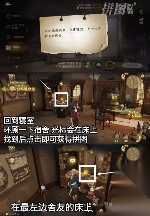 具体地点在【草药课教室】,进入后找到卡珊德拉,与她对话并战斗即可获得今天第一块拼图。进入【草药课教室】需要从城堡上空向舞会方向飞一段距离。 线索:“噩梦或美梦,上床睡觉,下一片碎片会现身。" 进入寝室,在最左边的舍友床上有光标,点击可获得拼图。