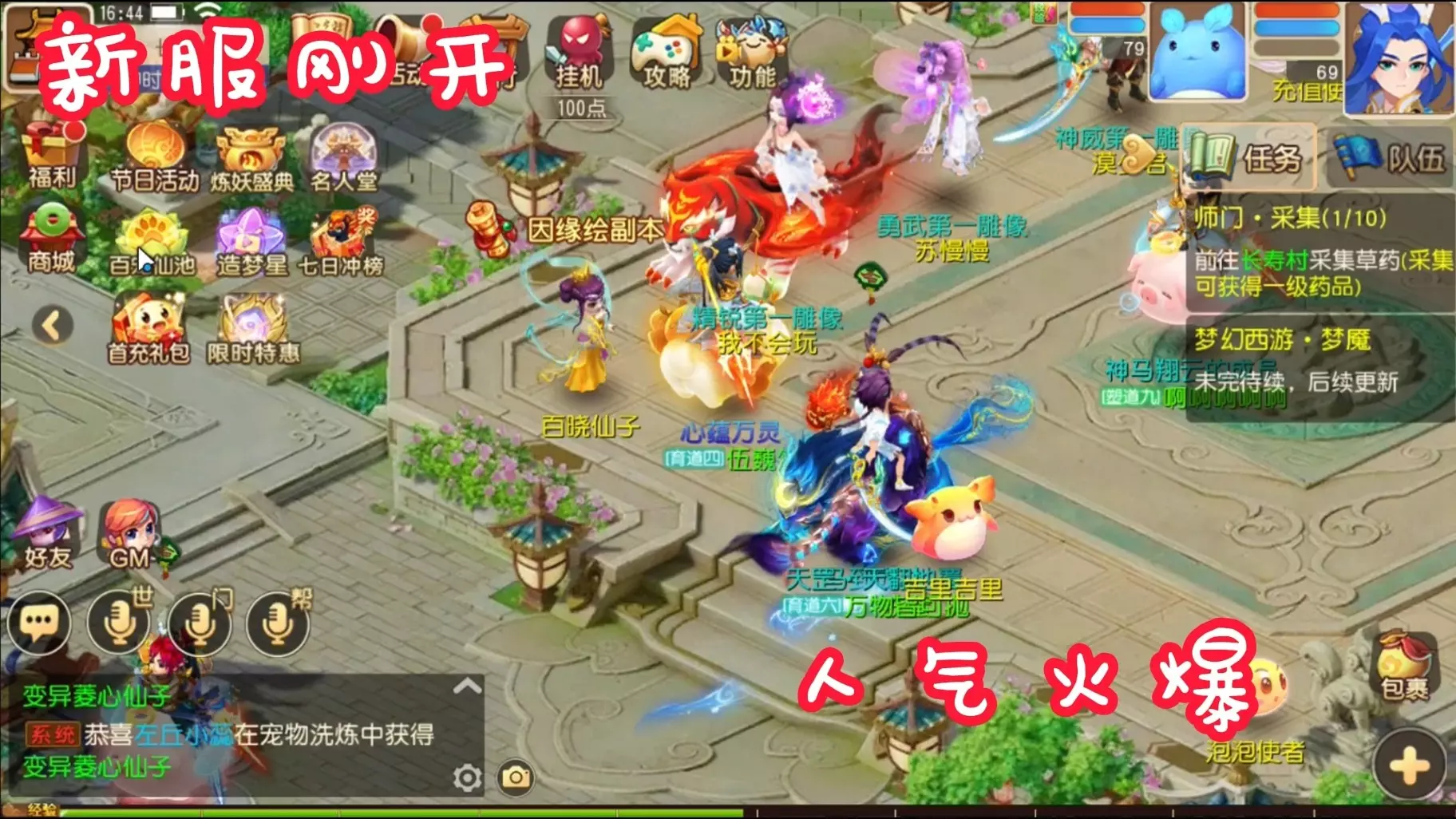 这是新开的梦幻西游三端互通服,支持一键组队、一键五开,有高效五开组合,所有道具皆可爆出,还有超多新手福利,可体验九黎城等战斗玩法。