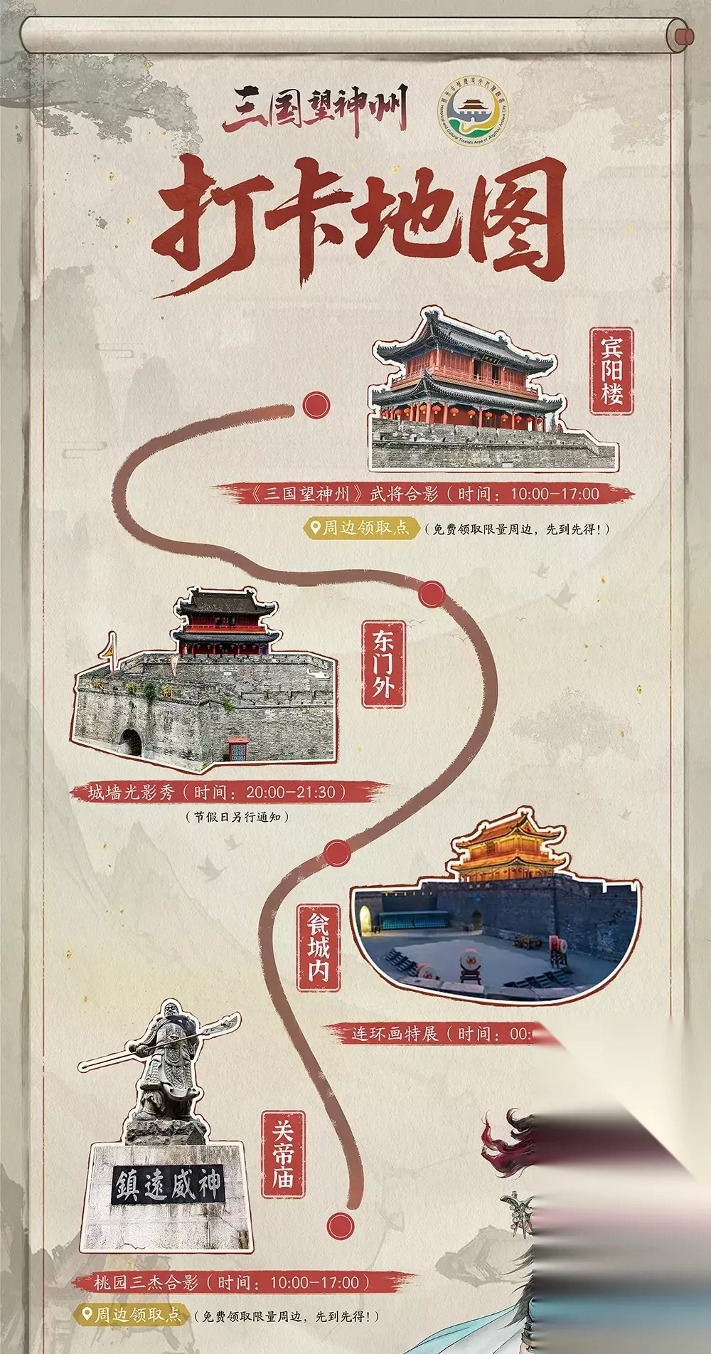 宾阳楼:三望武将合影时间:10:00 – 17:00 登临宾阳楼,俯瞰荆州城垣。此处设有《三国望神州》武将合影区,等待与诸位明公合影留念。完成打卡,即可领取限量精美周边,数量有限,先到先得!