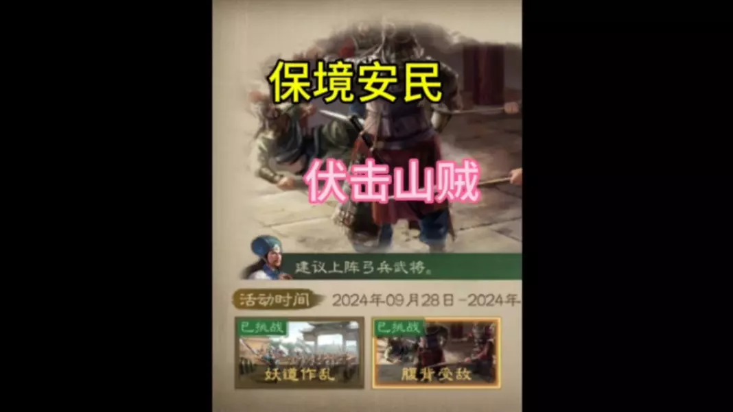 这是《三国志战棋版》夏日活动“保境安民”的万箭齐发关卡攻略,展示了解良县关卡的战斗通关阵容与战斗过程,我方以马腾、庞统等武将组成的队伍战胜盗匪队伍,可参考该阵容通关此关卡。