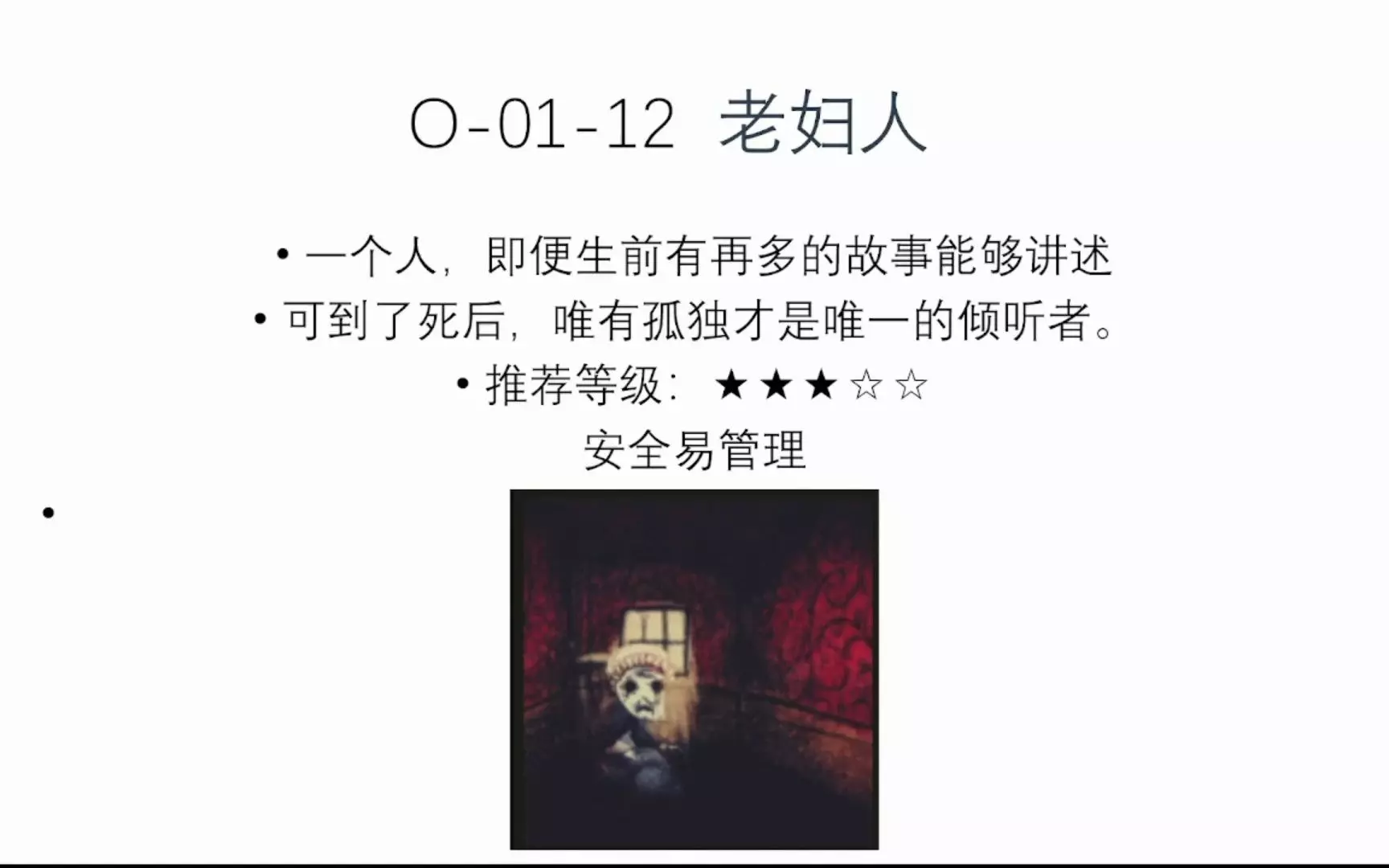一个人,即便生前有再多的故事能够讲述,可到了死后,唯有孤独才是唯一的倾听者。 希望尽可能地给新人主管带来最简单易懂的异想体管理方案 欢迎大家来玩!