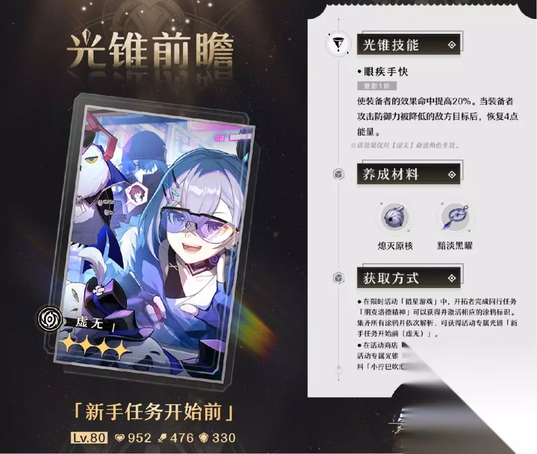 新手任务:提供更多命中词条、提供更优秀的大招循环。 0魂银狼:雨一直下4动循环且命中词条需求更高,新手任务稳定3动循环; 1魂银狼:雨一直下3动循环且命中词条需求更高,新手任务大部分情况下2动循环; 2魂银狼:雨一直下3动循环且解放输出能力,多边形战士,新手任务大部分情况下2动循环,优势在性价比高。 “雨一直下”小有强度但比“新手任务”强不了多少,推荐0魂银狼直接选择“新手任务”提高功能性,“雨一直下”要等后期遗器词条毕业后可以兼顾输出能力时才有优势。 崩坏星穹铁道0命银狼光锥推荐