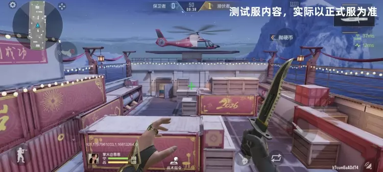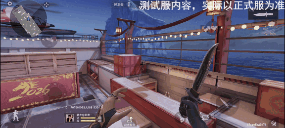 到了潜伏者阵营一边,在地图核心建筑的顶部,直接替代了经典版的工业标识,换上了“2026 恭贺新春”的鎏金书法字,搭配一尊昂首扬蹄的金色马形雕塑十分和谐,原本灰色的集装箱被通体刷成正红色,边缘以鎏金勾出祥云、卷草纹,悬挂着的小灯泡在夜晚场景下,灯光会在海面投下柔暖的光斑,消解了原地图的 “肃杀感”。