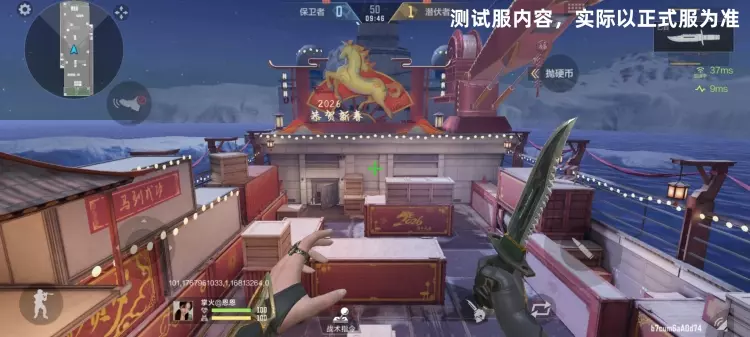 保卫者阵营这边的地图设计也同样优雅,原先十分单调的灰色集装箱变成了印着“2026”马纹的红金箱;两侧高台的护栏上挂起了宫灯,甚至连原本裸露的起重机钢架,都缠上了红色绸带。
