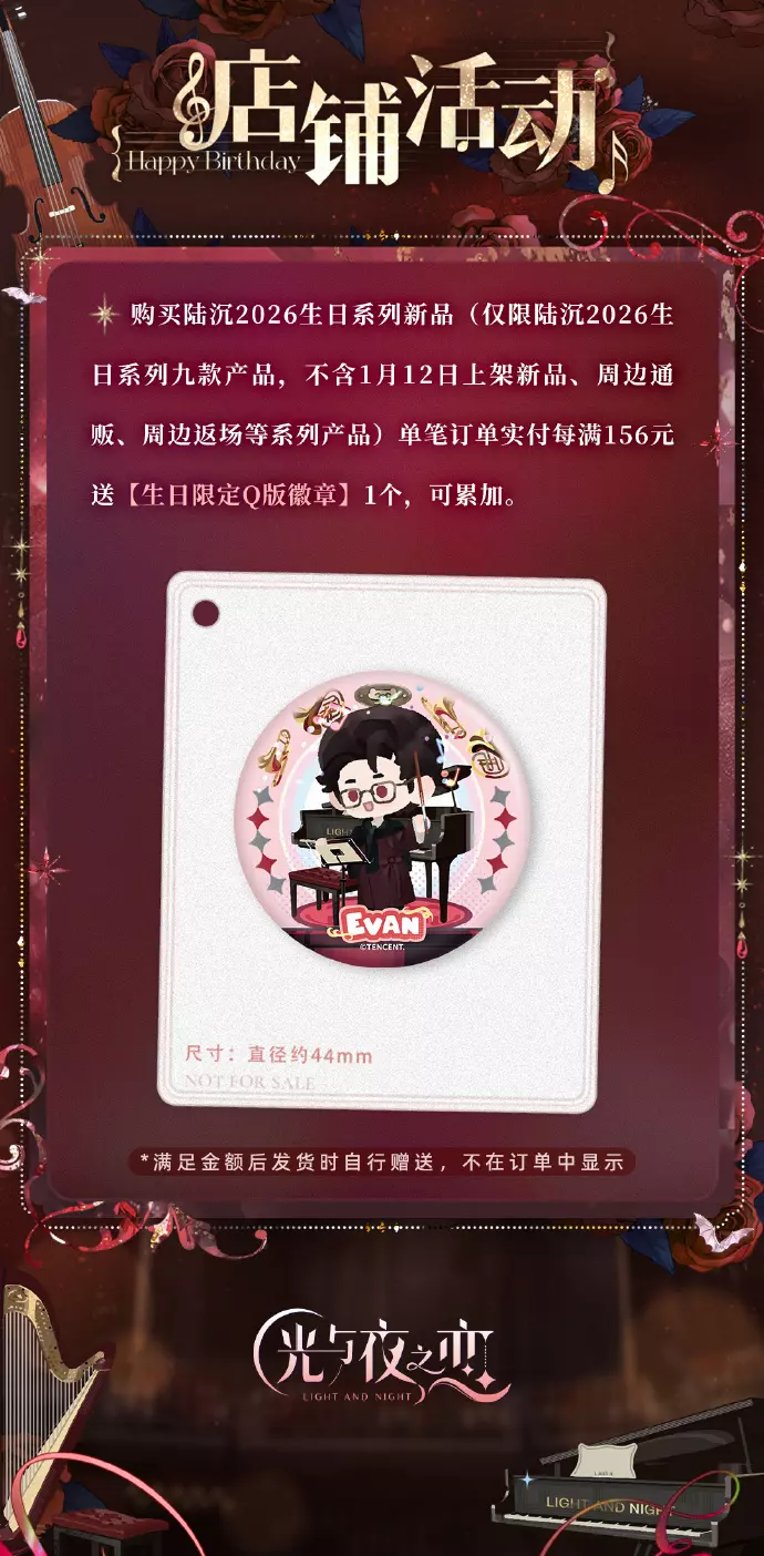 ◆ 购买陆沉2026生日系列新品(仅限陆沉2026生日系列九款产品,不含1.12日新品、周边通贩、周边返场等系列产品)单笔订单实付每满156元送陆沉生日限定Q版徽章1个,可累加(满足金额后发货时自行赠送,不在订单中显示)。