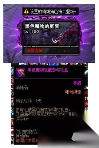 9.黑色魔物的庭院 推荐程度:低。 这一项应该属于被大多数玩家忽略的内容了,毕竟只有每周末整点开放十分钟,时间要求比永恒大陆还要严苛。通关之后可以在下周四获得参与礼盒,开启随机获得50~250个时间引导石。 嗯,能想的起来就刷一下吧,想不起来也没办法,定点开放条件过于苛刻了。