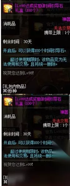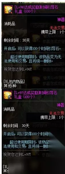 8.等级达成奖励 推荐程度:中。 角色在升级至96、97、98、99、100级时可获得时间引导石礼盒,共计500个。 实在没票刷了的时候掏出自己的冒险团肥料升一波级,爆出装备分解狗眼供大号刷也不妨是一种办法。不过如果脸黑的话有可能无功而返。