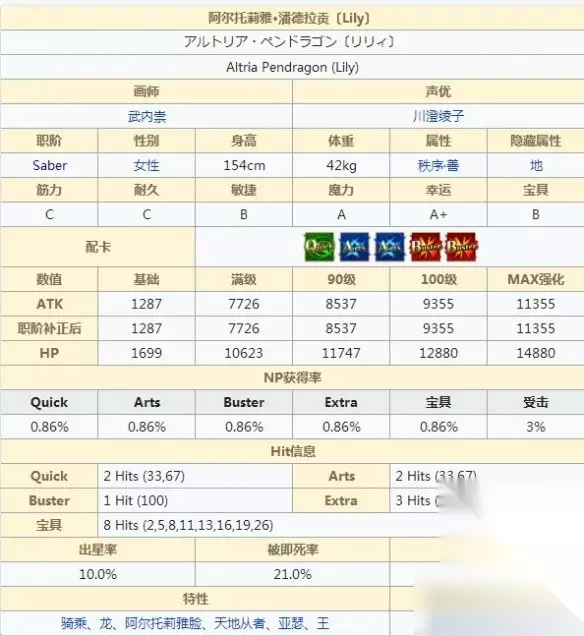 2Q2A1B lily作为4星剑阶光炮,满级双围为:ATK 7726, HP 10623,通过芙芙可以强化至:ATK 8725 HP 11622,就白值来说四星最低..... 配卡及NP 配卡AABBQ,hit数分别为蓝卡2,红卡1,绿卡2,EX攻击3,拥有2hit的蓝卡,NP率为0.86%, 有花之旅途技能的加成NP充能速度还可以。 具体一点,染色的A3有12.4NP,那么lily一套最大的充电combo为AQAEX,在不触发鞭尸补正和暴击补正的前提下能够回6.88+4.46+12.04+5.16=28.54NP,算是一般水平了, 如果配上花之旅途技能加成的话是34.22,技能以10级为基准。