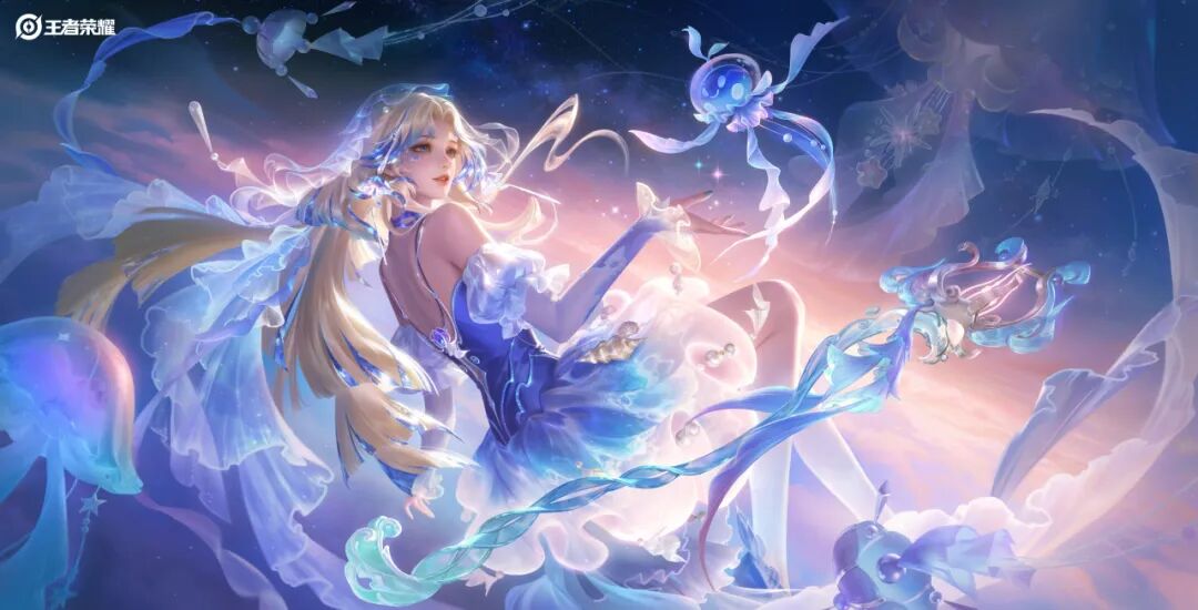 ✦三技能:王昭君召唤出一片梦幻海域,边缘缭绕被晨光浸染的金色云朵;云朵间浮现水母竖琴,琴弦自动奏响,召唤两只飞鱼环绕海域遨游;随后鲸鱼幻影从海域中腾空跃起,其间贝壳、海螺与记忆碎片不断洒落;每一碎片击中地面时,都会唤醒一只发光的小灯塔水母,在海域内轻盈浮动。
