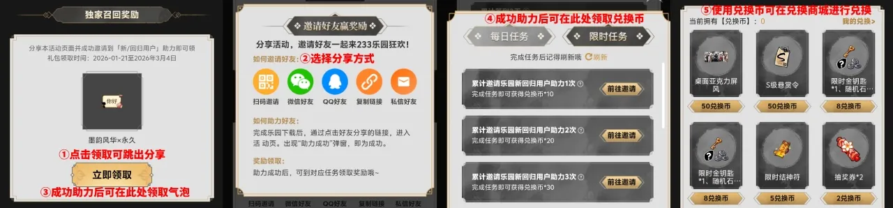 ①通过分享【《忍者必须死3》新春福利领不停】活动的专属邀请码,邀请新/回归用户助力,即有机会获得气泡——墨韵风华以及兑换币、邀请到的用户越多获得兑换币数量越多;兑换币可在下方商店进行兑换周边、S级悬赏令等