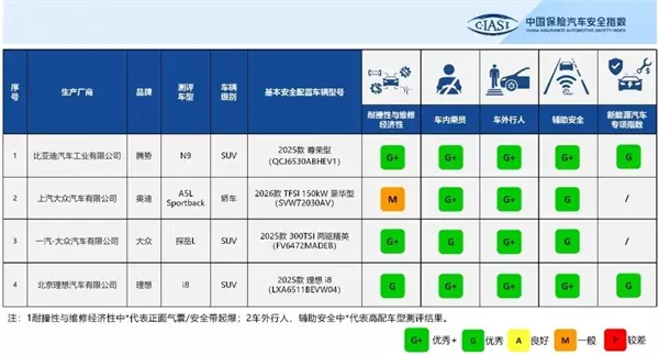 快科技1月21日消息,中保研公布了2025年测评车型第二次结果,本次发布共涉及4款车型,包括腾势N9、奥迪A5L Sportback、大众探岳L、理想i8。测评结果显示:耐撞性与维修经济性分指数,2款车型获得优秀+(G+),1款车型获得优秀(G),1款车型获得一般(M)。结构耐撞性得分方面获得优秀评价的车型2款(腾势N9、大众探岳L);可维修性得分方面获得优秀评价的车型3款(奥迪A5L Sportback、大众探岳L、理想i8),维修经济性得分方面获得优秀评价的车型1款(大众探岳L);碰撞兼容性方面获得优秀评价的车型3款(腾势N9、大众探岳L、理想i8)。有3款车型在低速主动安全方面获得加分(腾势N9、大众探岳L、理想i8),获得优秀评价的车型2款(腾势N9、理想i8)。车内乘员安全分指数,4款车型的评价结果均为优秀及以上,其中3款车型获得优秀+(G+)。在驾驶员侧正面25%偏置碰撞工况、乘员侧25%偏置碰撞工况、正面50%偏置碰撞工况和侧面碰撞工况中,4款车型获得优秀评价;车顶强度工况中,获得优秀评价的车型比例为100%;座椅/头枕工况中,获得优秀评价的车型比例为100%。