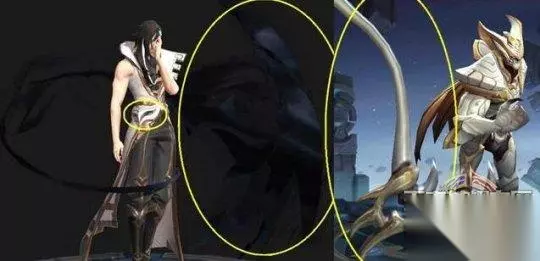 此次官方在司马懿模型方面卖了个关子并未PO出正面照,只能看出是一位身材挺拔裸露双臂的长发英雄,除了腰间的面具是一亮点外,司马懿没有实体武器,身边环绕了一个动态的黑色虚影特效,该特效的形态和死神镰刀相似,类似白起的皮肤白色死神武器,大家可以看看两者的对比: